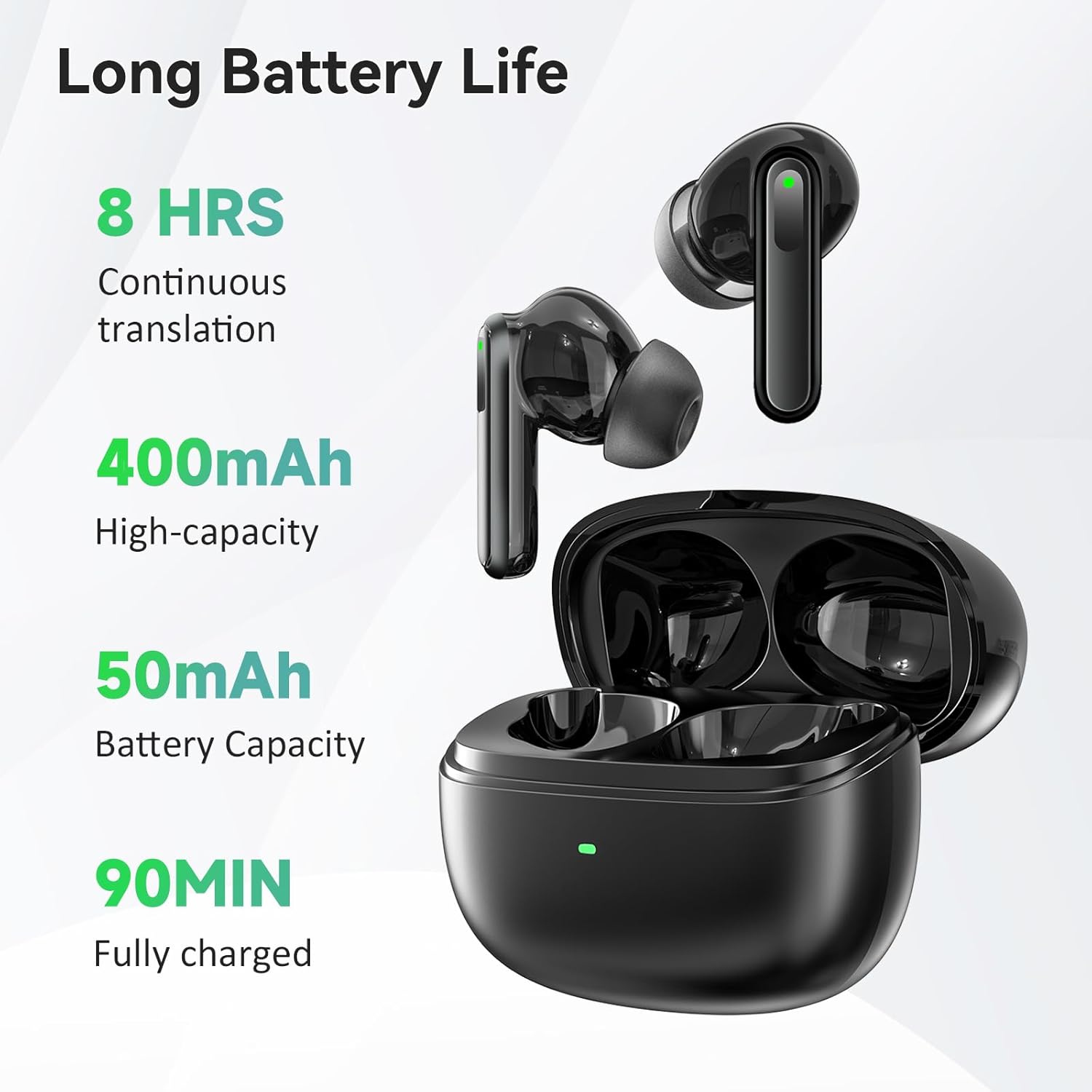 【Long Battery Life】This translation earbud is equipped with a 100mAh high – quality battery, enabling it to work continuously for 10 hours. The charging case of the earbuds is equipped with a 400mAh high – quality battery, and with the charging case, it can be used for up to 30 hours. You can take it with you wherever you go without worrying about running out of battery. Moreover, it has advanced noise cancellation and unique speakers, so it can achieve accurate real – time speech recognition even in noisy environments. This translation device is ideal for travel, foreign language learning, and business trips.