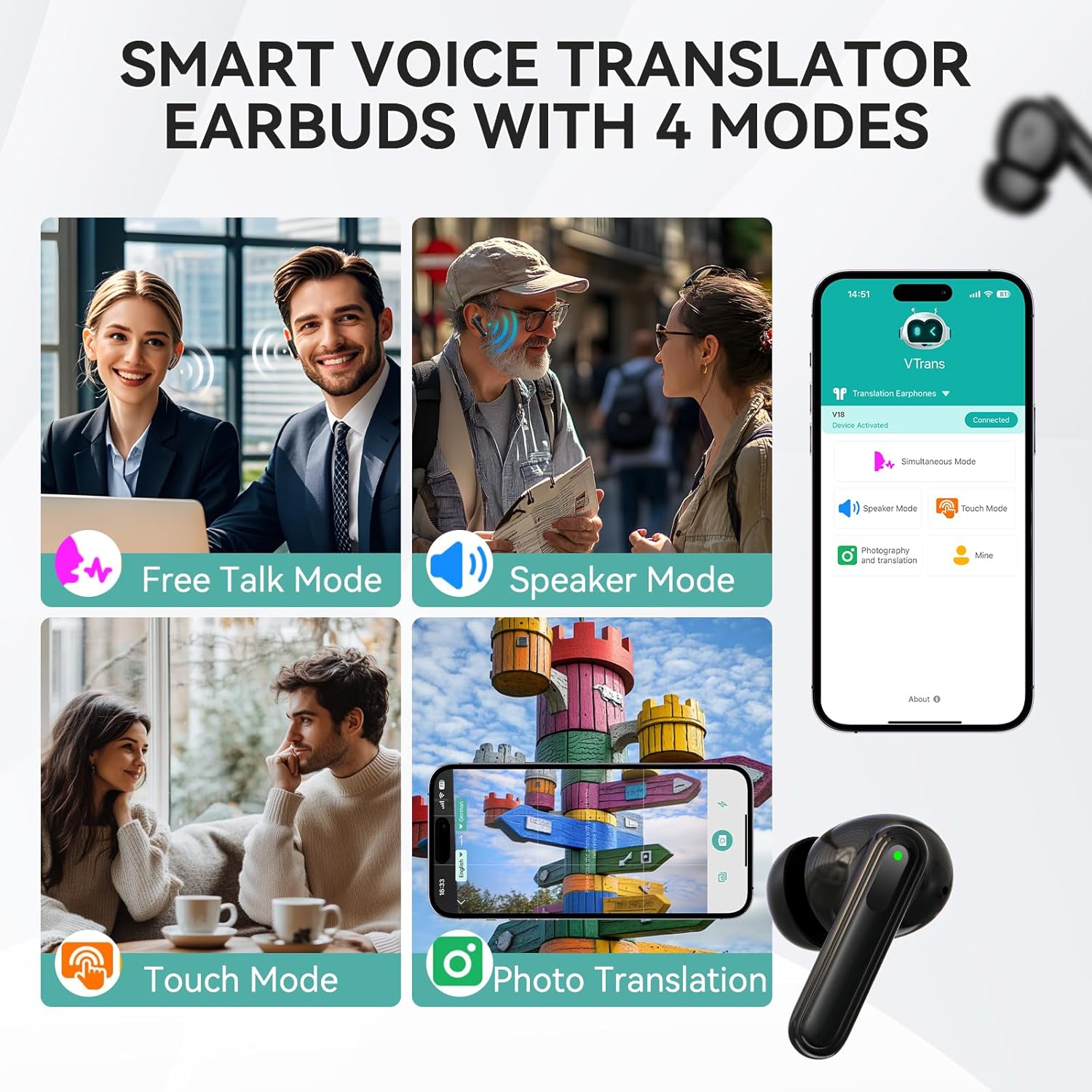 【Three in one Translation Mode】Our wireless translation earbuds come with touch mode, external mode, and free speech mode. You can select the appropriate mode according to different scenarios to ensure smooth communication at any time and in any place.