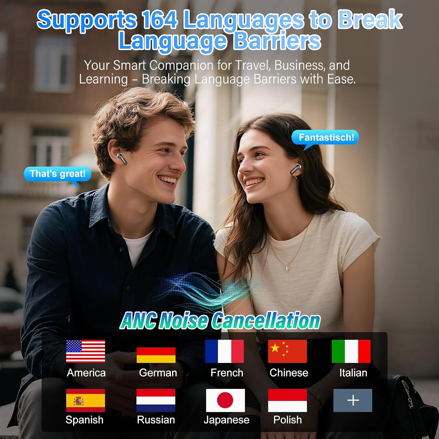 Three-in-one functionality and dual noise reduction: The translation earbuds integrate translation, music, and calls in one, easily meeting diverse needs. Equipped with ANC active noise cancellation, they block ambient noise for immersive listening; the ENC chip filters background sounds, making every conversation clear. Whether for language learning, cross-border communication, daily conversations, The translator earbuds real time provide a smooth and enjoyable experience.