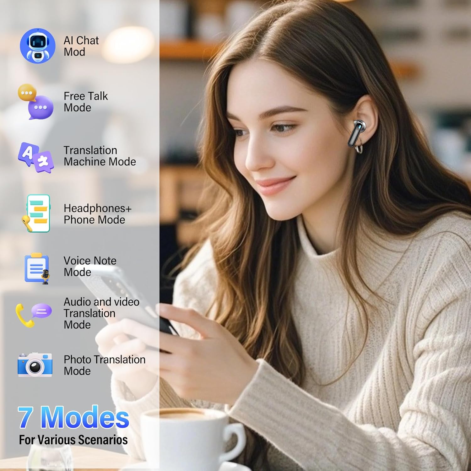 5 Other Translation Modes: In Free Talk mode, there is no need to tap the phone or headset, the AI translation earbuds automatically detects and translates the language in real time. Headset + Phone mode allows one person to double-tap the headset while the other taps the phone button for two-way conversation. Translation mode works the same as a traditional translator, with the phone speaker playing the translated language. Camera Translation mode recognizes and translates text with the camera.