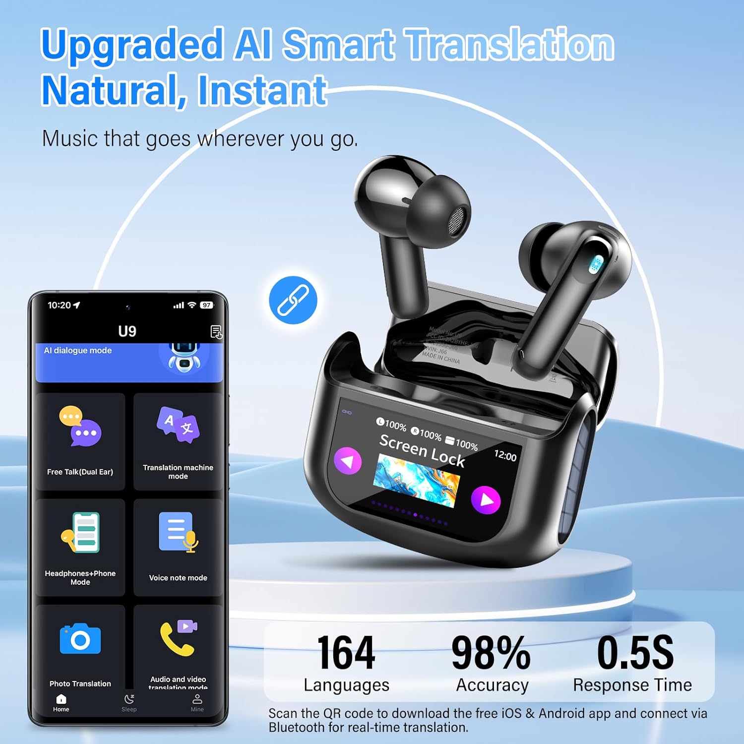 Smart Touch Screen Design: The U9 ai translation earbuds real time supports charging box and dual-ear touch control. Simply touch the charging box to play/pause music, change song, answer/end call, and you can also perform these operations by touching both ears. The ear bud translator device all languages can be easily paired with both iOS and Android devices.