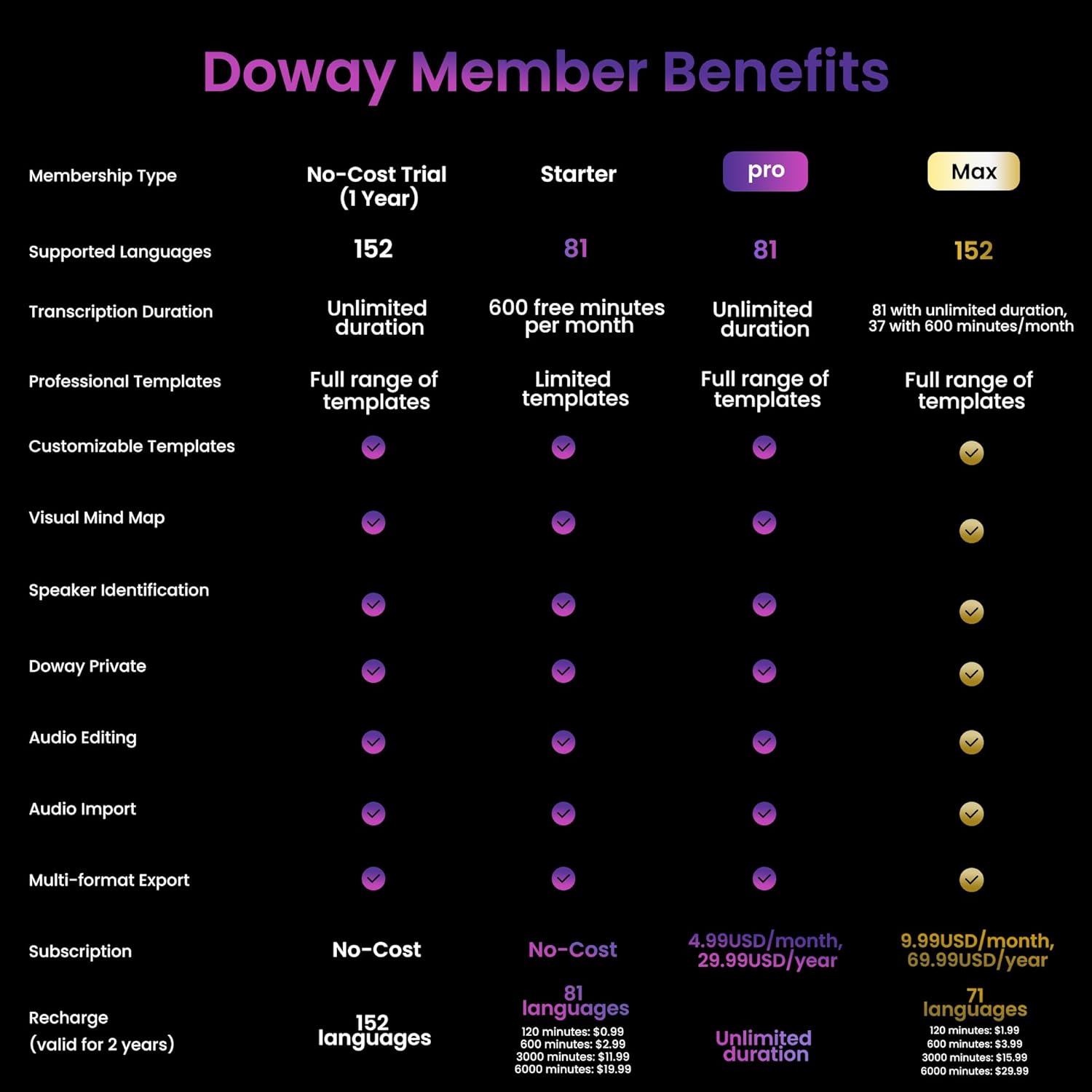 1-Year Unlimited Premium Suite: Unlock 12 months of free DOWAY premium access with your powerful voice recorder: Enjoy limitless transcription, AI-powered professional templates, and smart note-organization tools. Transform recordings into structured documents for business reports, academic notes, or content creation