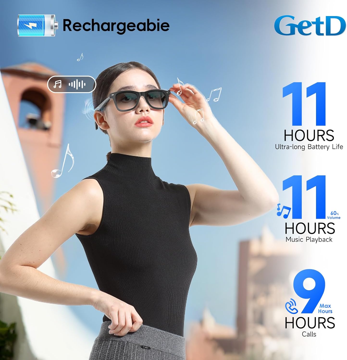 【Music & Call Glasses】: The GetD AI glasses are equipped with two 115mAh batteries. A full charge offers 15 days of standby and 11 hours listen music, 9 hours calling (at 50% volume). Charging 10 mins, 1 hour use; over-voltage and overload protection, magnetic charging and integrated design ensure IP54 water resistant. A good gift for family, friends and colleagues